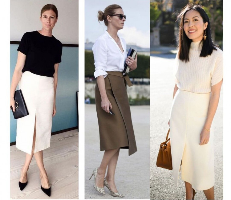 Спідниця-міді – справжній порятунок в діловому гардеробі в будь-якому сезоні. Влітку поєднуємо її з будь-яким верхом, будь то блузки, сорочки, футболки, поло, топи в білизняному стилі. Єдине, чого варто уникати – занадто обтислих і укорочених моделей. Хоч вони і в тренді, але в офісі їм явно не місце.
