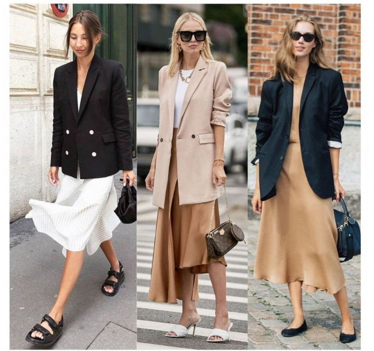 Неймовірно жіночне, проте досить строге поєднання – це міді-спідниця з жакетом. Під жакет можна надіти базовий топ, майку або футболку, можна надіти кроп-топ і застебнути жакет, так, ніби під ним нічого немає. Образ на межі провокації, але якщо в вашому стилі і на роботі таке допустимо, то обов’язково варто спробувати. Жакет – завжди відмінний варіант другого шару на літо.