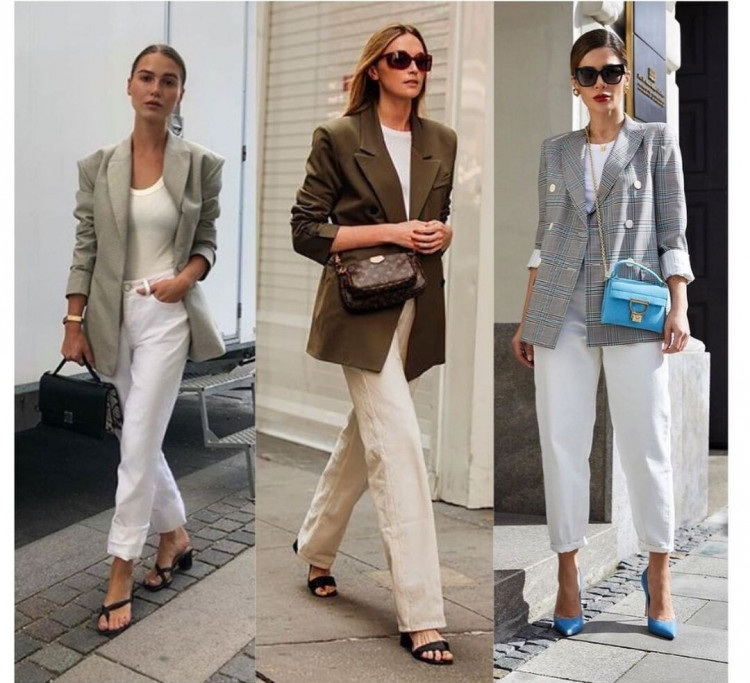 Не обов’язково все відводити в тотальну строгість і носити жакети тільки в комплекті, костюмом. Зробити образ трохи більш розслабленим допоможуть джинси. Але не класичні сині (це вже зовсім кежуал), а в світлих відтінках – бежеві, молочні. Тут також важливий актуальний крій джинсів, інакше стильного образу не вийде.
