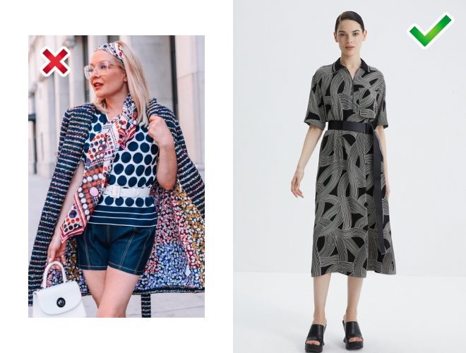 Строкатий принт, в якому намішано «всього і більше», неминуче викликає асоціації з овердресингом. Спроби поєднати в єдине ціле геометрію, квіткові мотиви, смужки та абстракції породжує лише одне бажання: скоріше це «розбавити»!