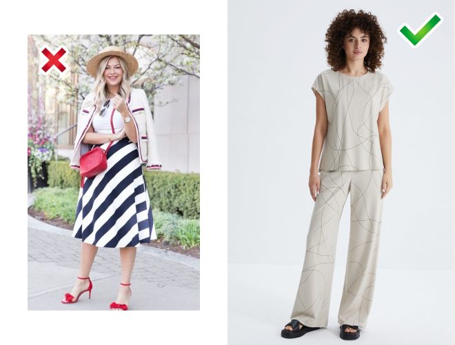 Смужки та плавні лінії — класичні принти, які незмінно асоціюються у нас із літом та морем. Однак ті, що можуть зробити із силуету безформне щось, обходимо стороною. Наприклад, діагональні хвилеподібні смужки на фасонах, що облягають фігуру.