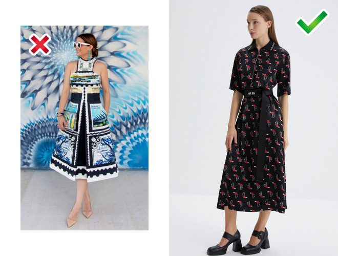 Своєрідна «сукня-картина» створює враження фотошпалер і візуально спотворює фігуру. Такий малюнок відволікатиме увагу від вас та інших речей — повноцінний образ, на жаль, не складеться.