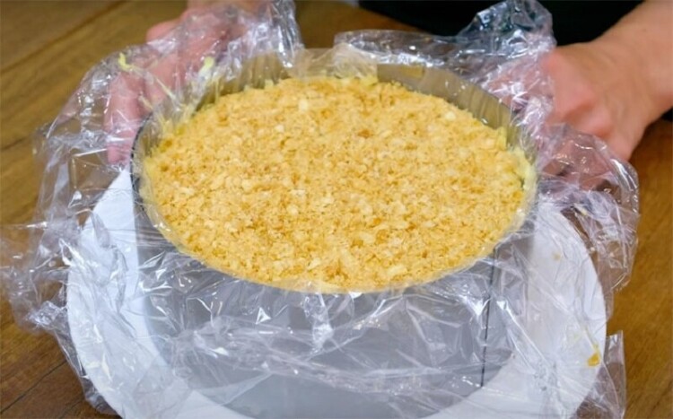 Верхнім шаром повинен виявитися крем. Його засипаємо залишеним печивом, подрібнивши його в крихту. Краї плівки піднімаємо вгору і закриваємо ними торт. Прибираємо форму в холодильник на 1 – 3 години.