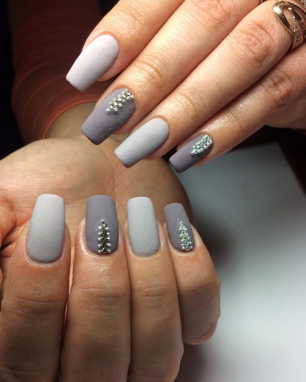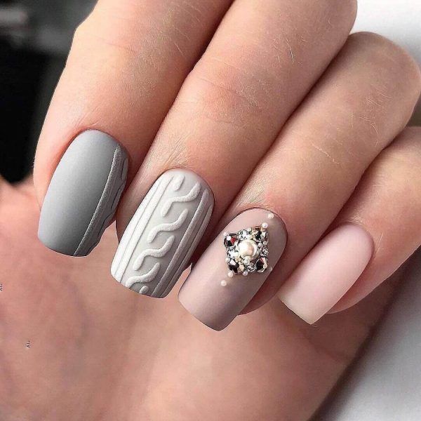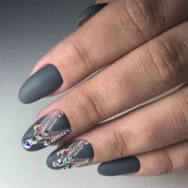 Навіть любителькам ніжного нейл-арту іноді потрібно стати трішки яскравішими. Дизайн зі стразами дозволить своїй володарці сяяти, але не відступати від звичного стилю. Все що потрібно – це прикрасити нігтики розсипом каменів та страз. На сірому фоні вони виглядатимуть неймовірно. При цьому не потрібно хвилюватися, що стрази зроблять нейл-арт занадто яскравим або навіть вульгарним. Основний відтінок пом’якшить манікюр і зробить його максимально жіночним. Тож можете бути спокійними.