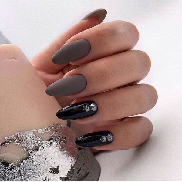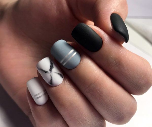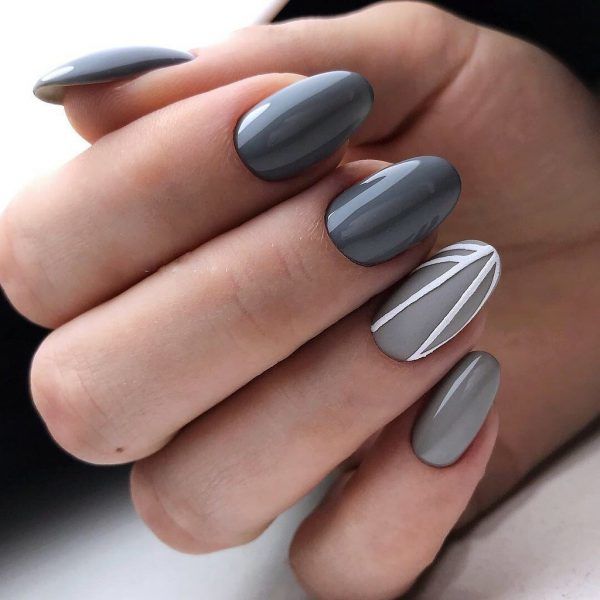 Чорний здатний додати чіткості будь-якому нейл-арту. Ним можна намалювати стильний і актуальний цього сезону геометричний малюнок, створити оригінальний принт. Також можна пофарбувати кілька пальчиків чорним, а решту – сірим покриттям. Такий варіант буде досить контрастним, але при цьому не конфліктуватиме з основним кольором.
