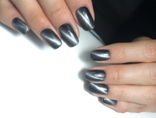 Привабливі магнітні лаки у сірих тонах знайомі далеко не всім модницям. У популярності вони, звичайно, не зрівняються з фіолетовим або бірюзовим, проте теж виглядають дуже цікаво. Слід зазначити, що ефект від дизайну котячого ока, виконаного в сірому кольорі, чимось нагадує камінь гематит.
