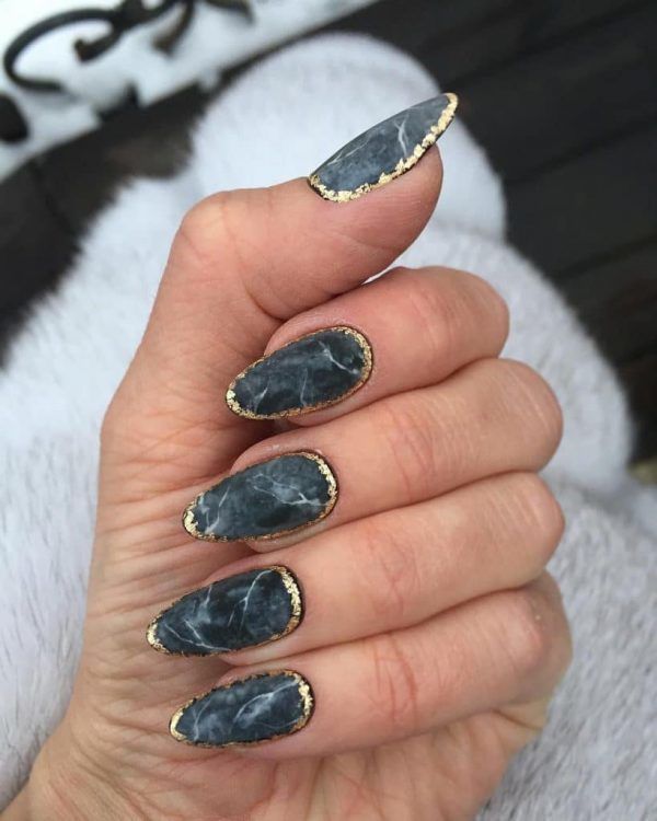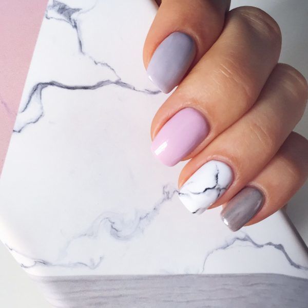 У класичному варіанті такий дизайн виконується з білого та чорного. Зрозуміло, сірий, бувши складовою вищезгаданих відтінків, просто не може виглядати погано в мармуровому нейл-арті. Якщо ви хочете зробити оригінальний і десь навіть колоритний манікюр, то мармуровий нейл-арт із використанням сірого – це саме те, що вам потрібно.