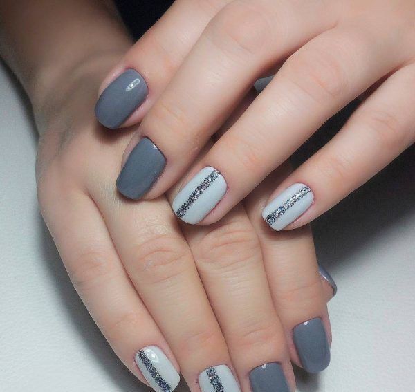 Подібний декор здатний створити холодний блиск і дивовижне сяйво. Сірий сам по собі – досить холодний відтінок, тому манікюр, виконаний у таких тонах, чудово гармонує з блискітками у будь-якій їхній інтерпретації. Модниця завжди може прикрасити парочку нігтиків блискучим лаком або, наприклад, додати його до градієнта.