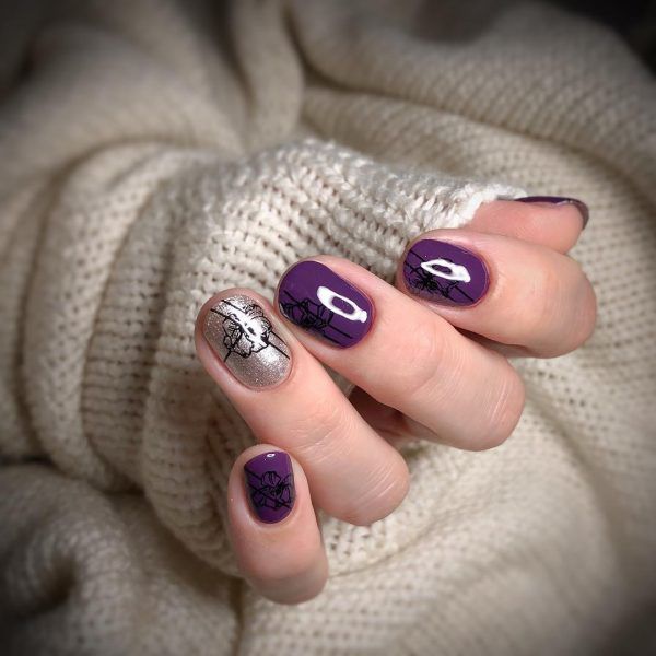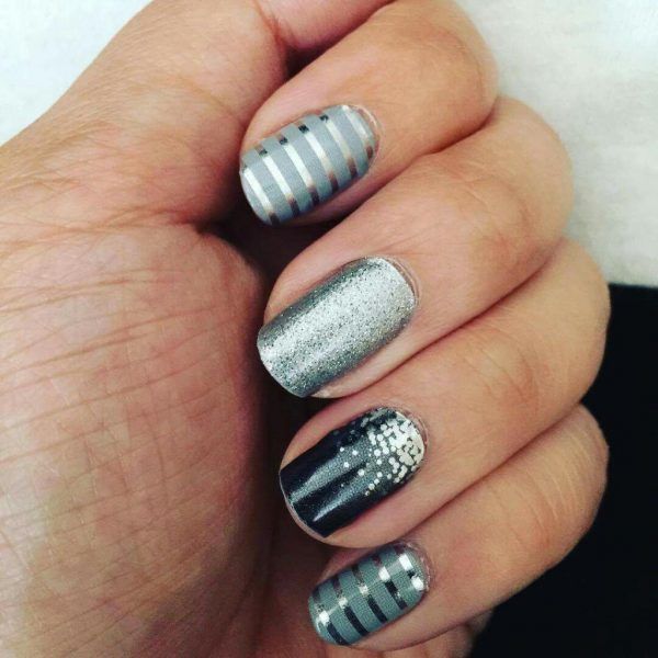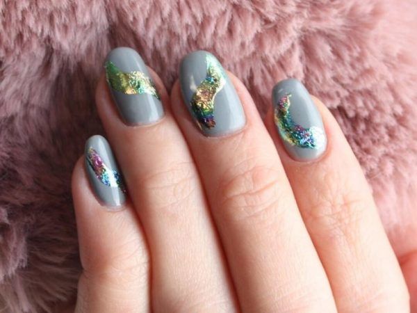 Декор у срібному кольорі, як і блискітки, відрізняється холодним відтінком і блиском. Тому манікюр зі сріблом абсолютно точно стане гарною прикрасою сірого нейл-арту. Як декор може виступати фольга, каміфубуки, смужки, що клеяться, або гліттер з великими шестикутниками.