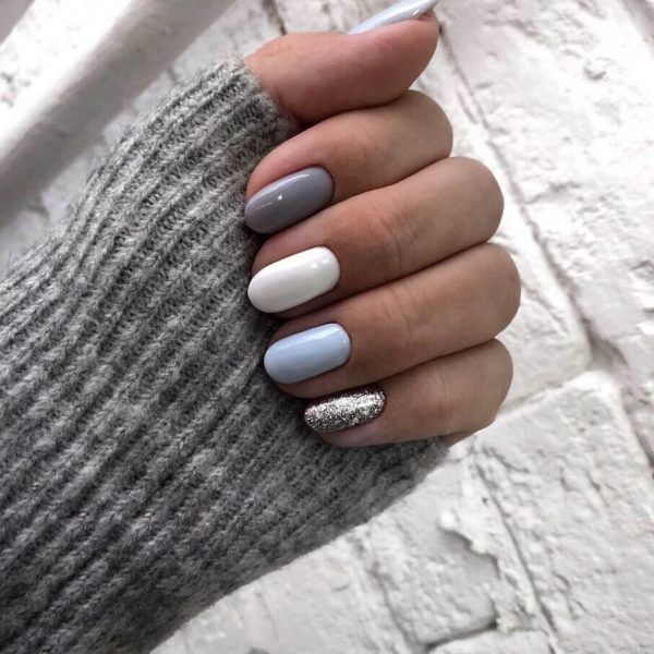 Сіро-блакитний манікюр виглядає дуже елегантно. Особливо актуальним є такий нейл-арт у зимовий період. А якщо перед модницею стоїть мета зробити такий манікюр яскравішим та святковим, вона завжди може погратися з відтінками та додати блискітки.