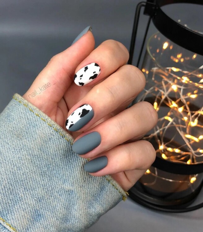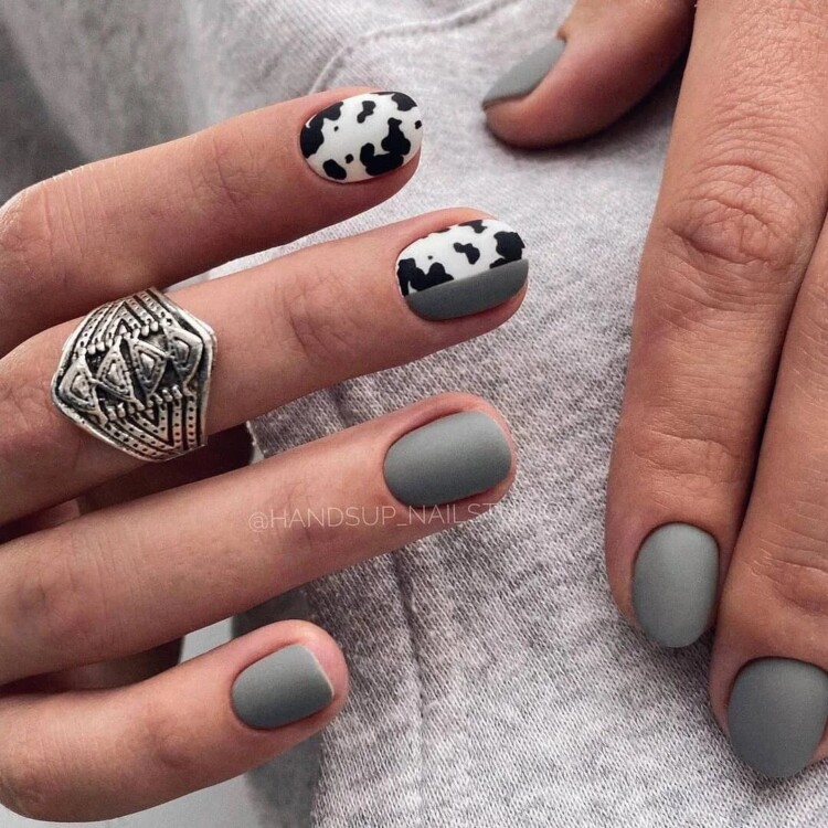 З сірим кольором лаку гармонійніше всього виглядає смужка, клітина, коров’ячий або ж леопардовий принти.