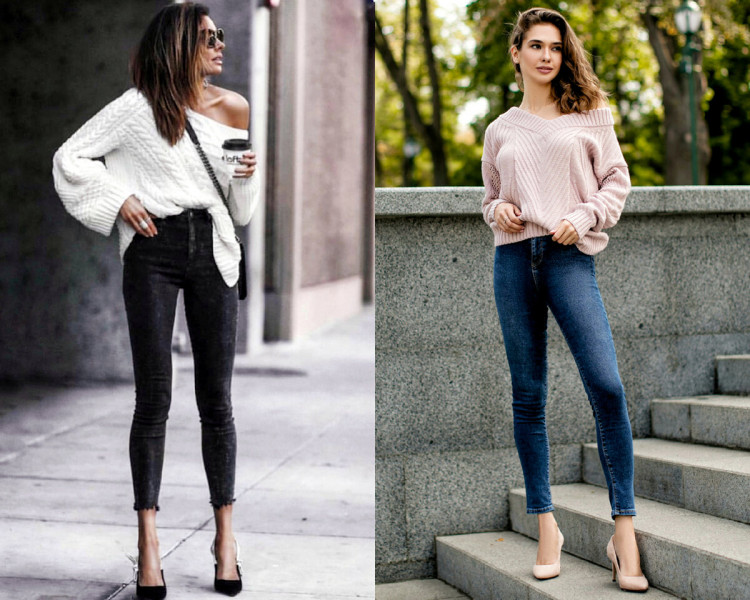 Для образів на прохолодну погоду існує безліч варіантів з джинсами скінні і актуальними оверсайз джемперами, але саме вдале поєднання для виходів на роботу, – об’ємний светр в нейтрально-стриманих тонах, базові аксесуари і акуратні човники. Щоб зробити образ завершеним і більш вишуканим, використовуйте непомітні прикраси, модні в цьому році: шкіряні ремені, елегантні сумочки, ланцюги на шию, чорні сонцезахисні окуляри. Фото-приклади доводять, що з базових речей в поєднанні з джинсами скінні можна отримати досить оригінальний діловий образ!