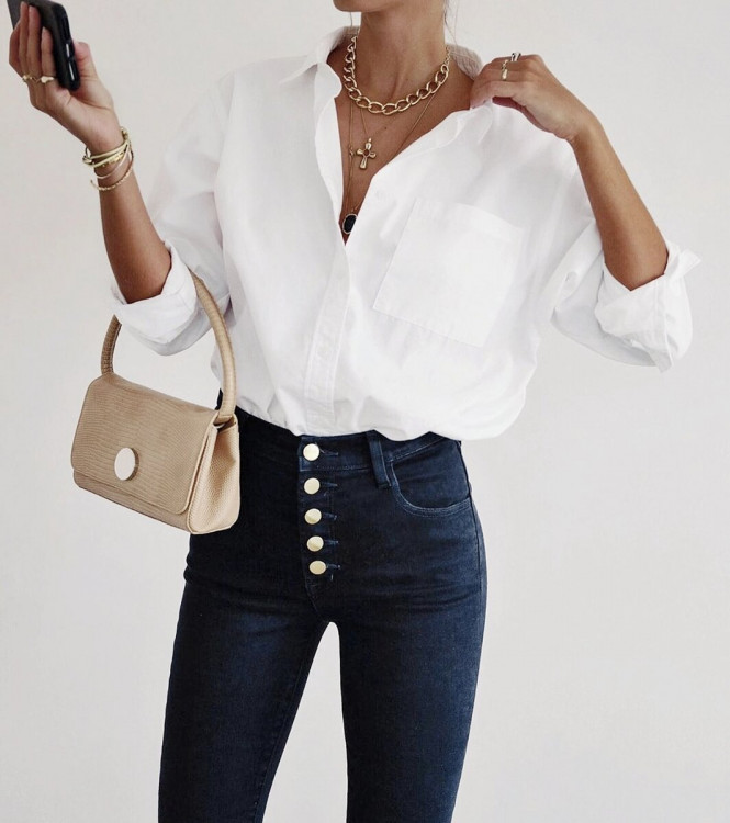 Оскільки діловий стиль вимагає стриманості, вибирайте базові відтінки джинсів: сірі, сині, чорні або молочні. Не забувайте, що висока посадка і заправлена в джинси блузка або сорочка візуально подовжують ноги, особливо в тандемі з витонченим взуттям на підборах, тому такі комплекти життєво необхідні дівчатам середнього і низького зросту.