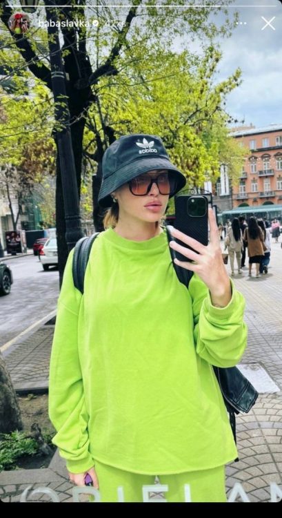 Пізніше Слава показала, як виглядає, гуляючи по вулицях міста. Артистка обрала яскравий салатовий костюм, доповнивши образ панамкою та стильними сонцезахисними окулярами.
