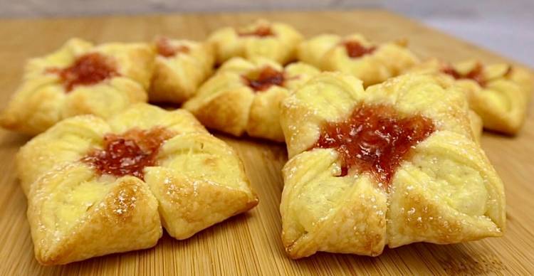 Змащуємо водою, посипаємо зверху цукром і в центр викладаємо варення або джем (у мене полуничне варення). Випікаємо 20 хвилин, в розігрітій духовці до 200 градусів.