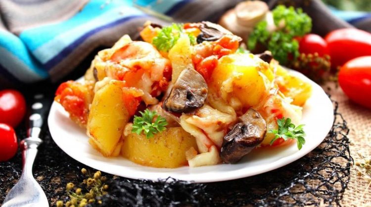 Ця страва з картоплі, грибів і томатів — чудове поєднання ніжних овочів і пряних спецій. Завдяки запіканню у духовці, овочі зберігають свою соковитість та аромат, створюючи ситний і смачний обід або вечерю.