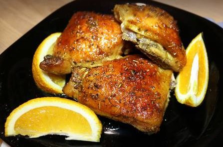 Спершу готуємо соус: з двох апельсинів вичавлюємо сік (150-200 мл), часник нарізаємо тонкими скибочками. Додаємо мед, соєвий соус, сіль та італійські трави. Все ретельно перемішуємо, щоб інгредієнти добре поєдналися. Куряче стегно викладаємо на дно форми для запікання і заливаємо підготовленим апельсиновим соусом. Накриваємо форму фольгою і ставимо в холодильник маринуватися на 2-3 години. Маринад зробить м’ясо більш ніжним і насиченим смаком. Розігріваємо духовку до 180-200 градусів. Виймаємо курку з холодильника, знімаємо фольгу і зверху викладаємо кружечки апельсина. Ставимо запікати на 45-50 хвилин, час від часу поливаючи курку виділеним соком, щоб вона не пересушилася.