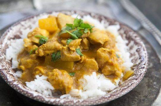 Наріжте куряче філе та манго середніми шматочками, а цибулю – дрібними. Часник пропустіть через прес, а імбир натріть на дрібній тертці. У сковороді розігрійте олію на середньому вогні. Підсмажте часник до м’якості, додайте імбир і помішуйте ще пів хвилини. Перекладіть усе в чашу блендера. Додайте два нарізаних манго, кокосове молоко, Каррі, сіль і перець. Збийте до стану пюре. На тій же сковороді трохи додайте рум’ян курці з усіх боків. Залийте соусом з манго та додайте гарячий бульйон. Після закипання прикрийте кришкою та залиште на помірному вогні приблизно на 15 хвилин.