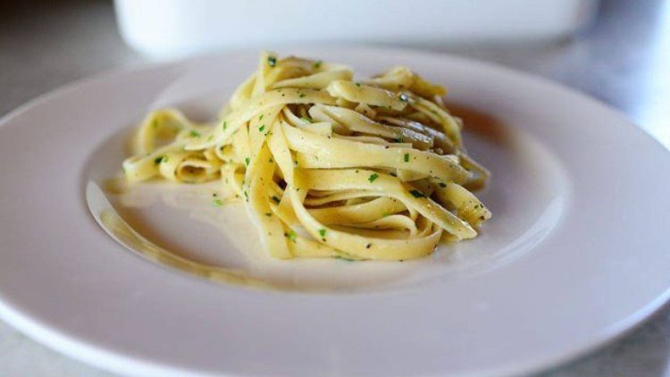 Відваріть пасту. Розтопіть у сковороді вершкове масло. Туди ж видавіть часник, через декілька секунд додайте туди пасту. Добре змішайте, додайте нарізану петрушку та полийте усе соком лимона. Посоліть і поперчіть. Перемішайте і подавайте до столу.