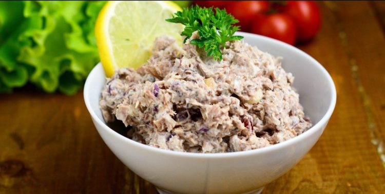 Яйця варіть вкрутню протягом 10 хвилин. Після варіння охолодіть їх та наріжте дрібненько. З консервів викладіть рибу, злийте рідину, видаліть великі кістки та роздеріть рибу виделкою. Цибулю наріжте дрібненькими шматочками. Покладіть усе в миску, поперчіть, посоліть та заправте майонезом.