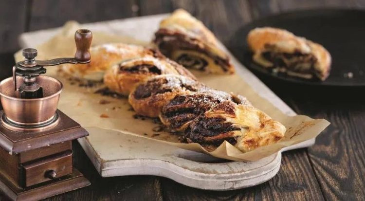 Застеліть деко пергаментом і змастіть його рослинною олією. Розігрійте духовку до 180 °C. Присипте стіл борошном. Викладіть половину тіста і трохи його розкочуйте. Рівномірно намастіть шоколадну пасту на тісто. Другий пласт тіста також трохи розкочуйте та накрийте ним перший. Наріжте тісто на смужки шириною 2-3 см. Кожну смужку скрутіть у косицю і викладіть на деко. Збийте яйце і змажте ним поверхню тіста. Випікайте 15-18 хвилин до золотистої скоринки.