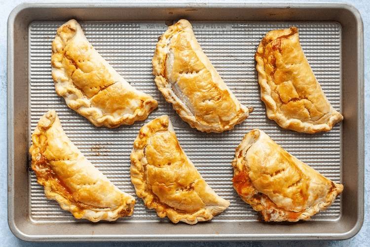 Розкочуйте тісто до товщини у чверть сантиметра і виріжте кружечки. На кожен кружечок покладіть варене куряче філе, шинку та трохи сиру. Згорніть тісто пополовині та обережно з’єднайте краї пальцями. Додатково ущільніть краї зубчиками від вилки, а самі міні піци змастіть збитим яєчним жовтком. Пекти при 200 градусах 15 хвилин. Подавати з томатним соусом.
