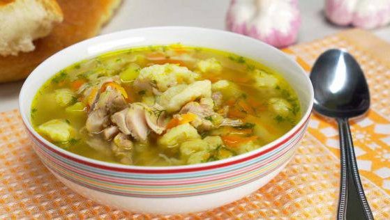 Курицю залийте холодною водою та доведіть до кипіння. Додайте очищену моркву і цілу цибулю. Варіть на помірному вогні приблизно пів години. Картоплю та моркву наріжте дрібними шматочками. Лук ріжте дрібненько. Витягніть пташку на тарілку, процідіть бульйон і знову доведіть до кипіння. Додайте картоплю і моркву, варіть 15 хвилин. Тим часом розігрійте в сковороді олію. За 3–5 хвилин підсмажте лук. Покладіть його в суп разом з куркою, підсоліть і проваріть 5 хвилин. Процідіть борошно із сіллю. Додайте яйця і добре змішайте. Отримане тісто викиньте в суп за допомогою ложки, утворюючи галушки. Перемішайте і варіть під кришкою на помірному вогні 5 хвилин. Перед подачею посипте суп зеленню.