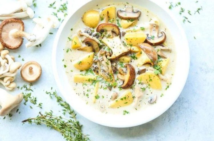 Розігрійте вершкове масло в каструлі та обсмажте на ньому нарізану цибулю та часник протягом кількох хвилин. Додайте борошно і бульйон. Добре змішайте. Варіть близько 10 хвилин. Наріжте картоплю та гриби середніми кубиками та додайте в каструлю разом з вершками та тим’яном. Варіть ще 15 хвилин. Подавайте гарячим.