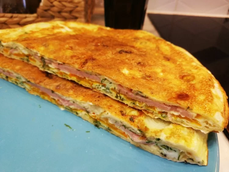Після (за допомогою тієї ж кришки) акуратно перевертаємо наш пиріг, щоб обсмажити другий лаваш (якщо хочете можете перед тим, як повернути пиріг для обсмажування на сковороду – вилити туди ще яєчної суміші). Якщо хочете зробити пиріг багатошаровим – повторюйте всі дії, можете міняти інгредієнти. Залишаємо пиріг на сковороді на повільному вогні ще на 3 хвилини.