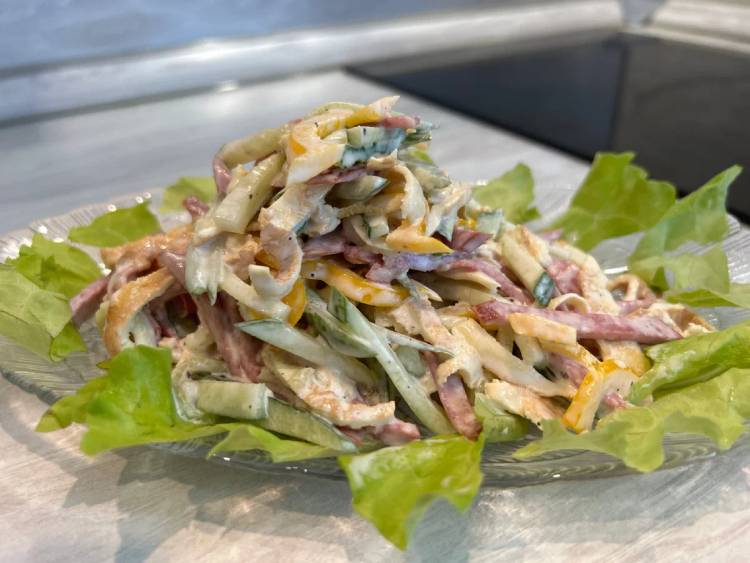 Нарізаю болгарський перець соломкою, у мене сьогодні жовтий, можна будь-який. Також нарізаю свіжий огірок соломкою та напівкопченою ковбасою, все нарізаю соломкою, щоб виглядало апетитно.