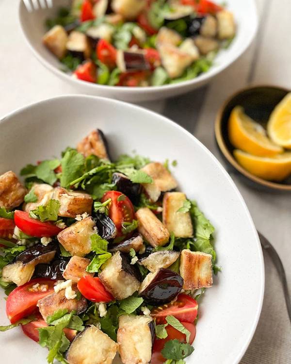 Взагалі цей «синенький» овоч дуже дивний. У сирому вигляді не представляє зовсім ніякого інтересу, але варто тільки запекти або посмажити, як він відразу перетворюється на невпізнанність. Пухкий, соковитий усередині та щільний зовні – його можна їсти просто так. Але ми додамо свіжості та кольору зелені та помідорів.