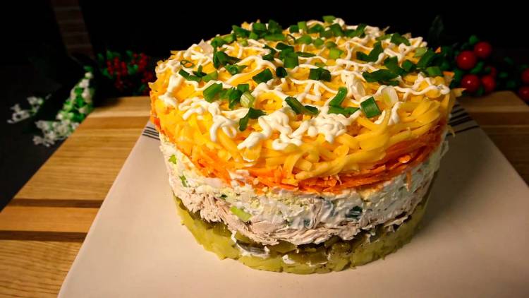 Далі морква свіжа 2 шт. натираємо на великій тертці. Додаємо до неї 3 зубчики часнику через прес та 1-2 ст.л. майонезу. Викладаємо у форму. Останній шар із твердого сиру 150 г натертого на великій тертці.
