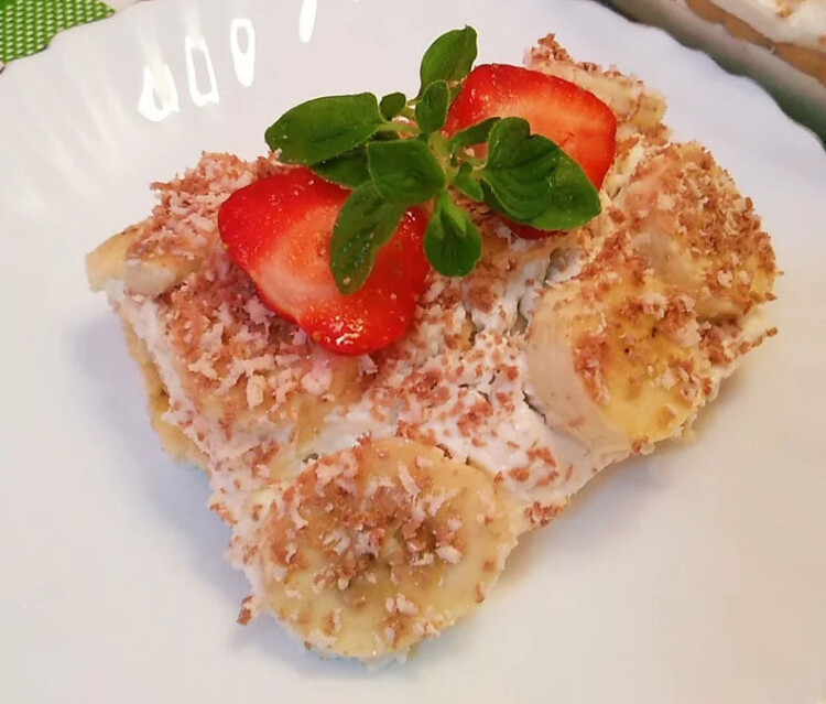 Цей десерт можна порівняти з тортом або тістечком! Виходить дуже смачно, ніжний сирний крем з прошарком з цукрового печива і фруктів.