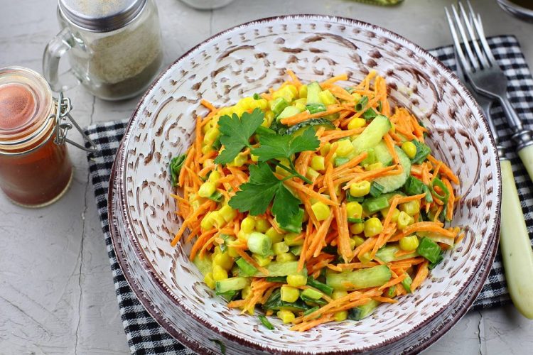Натерти моркву на тертці соломкою та додати кукурудзу. Нарізати огірки соломкою, а зелену цибулю, включаючи білу частину, нарізати кусочками. Всі інгредієнти перекладіть в миску, до свого смаку додати сіль, перець, полити олією та добре перемішати.