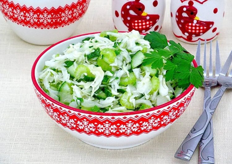 Нашинкуйте пекінську капусту тонкими смужками. Яблуко наріжте кубиками, огірок – кружечками або пів кружечками. Стебла селери подрібніть на невеликі шматочки. Додайте всі інгредієнти до миски, посоліть до свого смаку та добре перемішайте. Заправте салат кокосовою олією або замініть її будь-якою іншою рослинною олією на ваш смак.