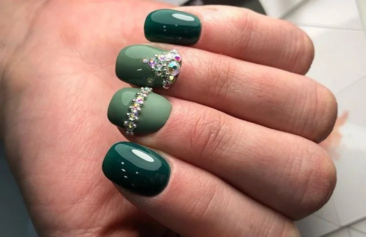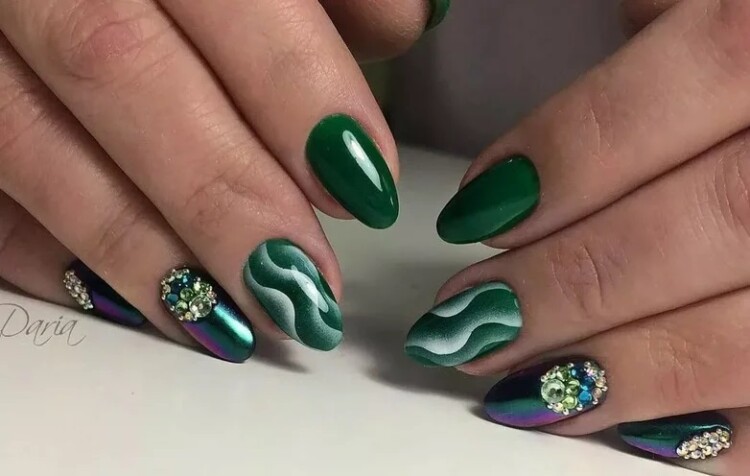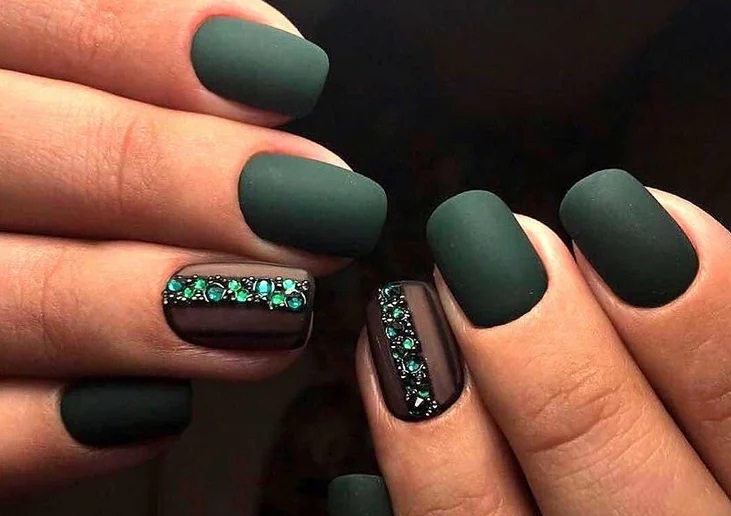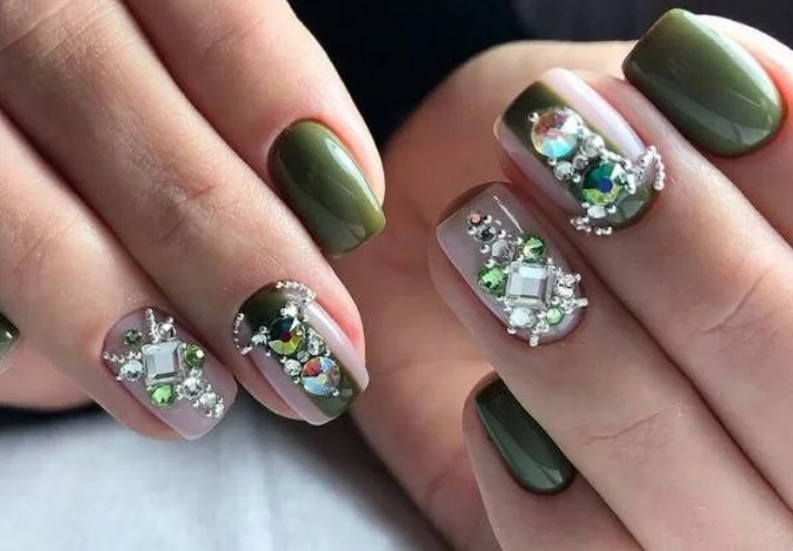 Такі елементи вже давно стали обов’язковим атрибутом будь-якого манікюру, тому майстри можуть застосовувати їх і на зелених нігтях. Такий декор виглядає особливо стильно і оригінально.