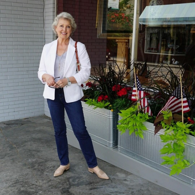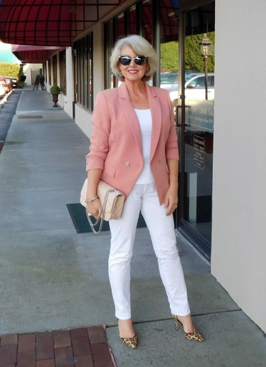 Жакет – вдале рішення для дами 50+. Це може бути укорочена або подовжена модель. Білий жакет гармонійно поєднується з чорними трикотажними брюками або джинсами, під низ можна надіти однотонну футболку або атласну блузу.