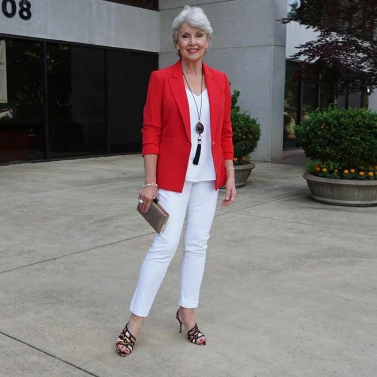 Розбавте білий тотал-лук кольоровим жакетом. Білий чудово поєднується з соковитим червоним кольором, не проходьте повз рожевого і його численних відтінків, які мають ефект anti-age. Доповніть образ босоніжками або класичними “човниками”.
