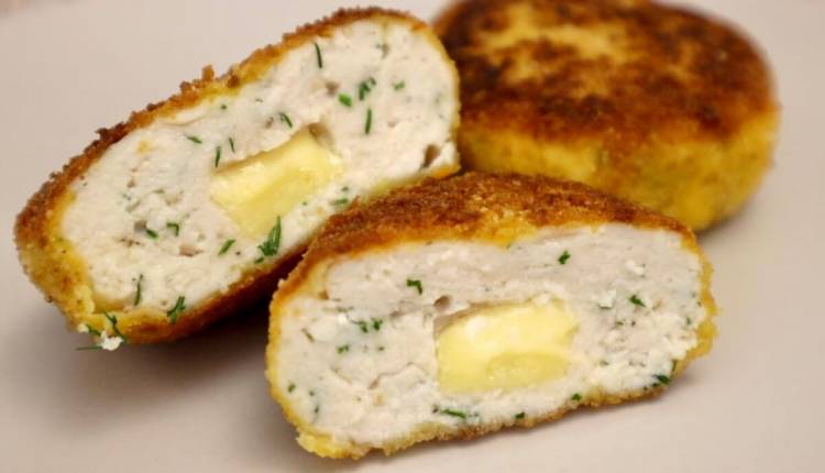 Руки трохи змащуємо соняшниковою олією, відщипуємо потроху підготовленого фаршу, всередину вставляємо шматочок сиру і формуємо котлету. Далі потрібно обваляти в борошні, в яйці і в панірувальних сухарях.