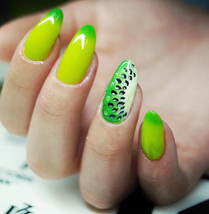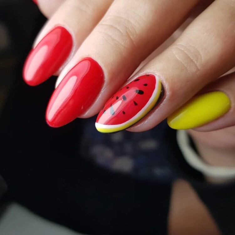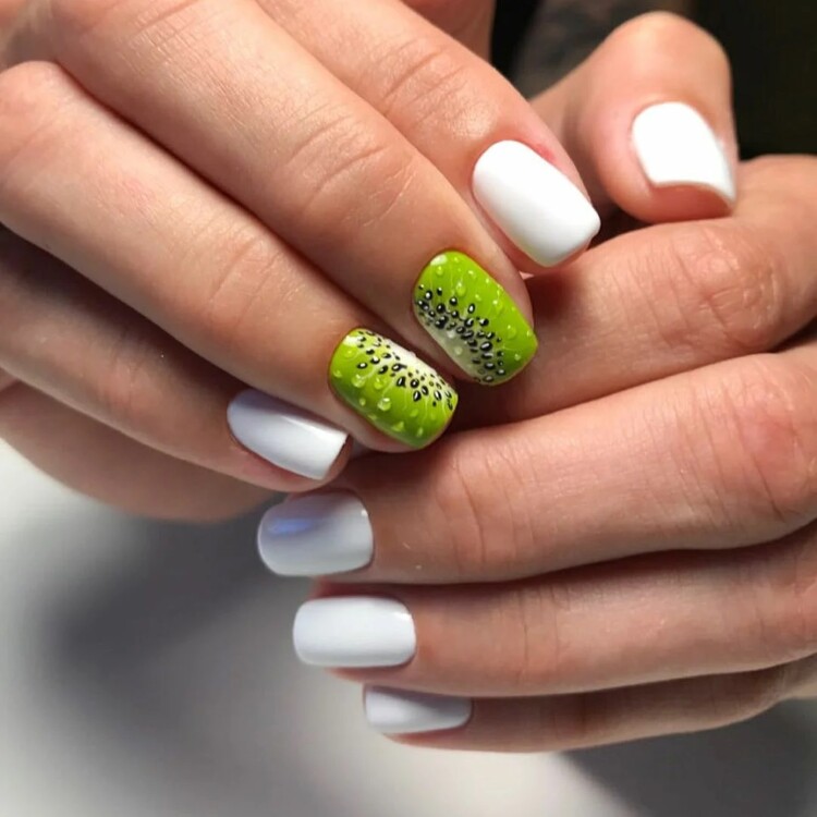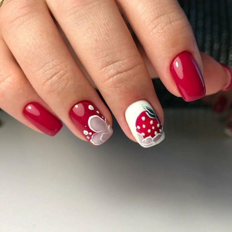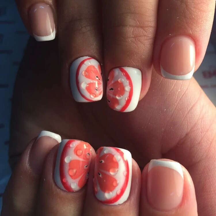 Особливо актуально влітку виконання у вигляді фруктів, ягід і квітів. Тут кожна дама має право вибрати свій колір і композицію, яку хоче виконати у себе на нігтиках. Зазвичай дівчата вибирають соковиті і яскраві відтінки для свого манікюру. Фруктово-ягідний нейл-арт нікого не залишить байдужим.