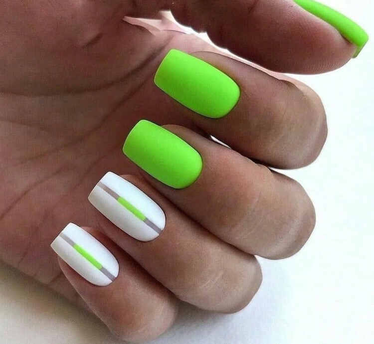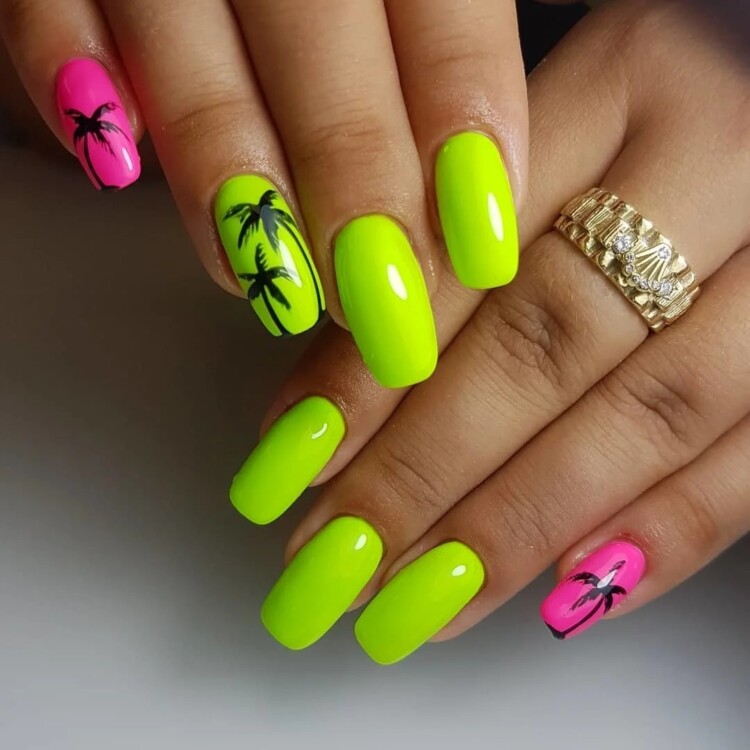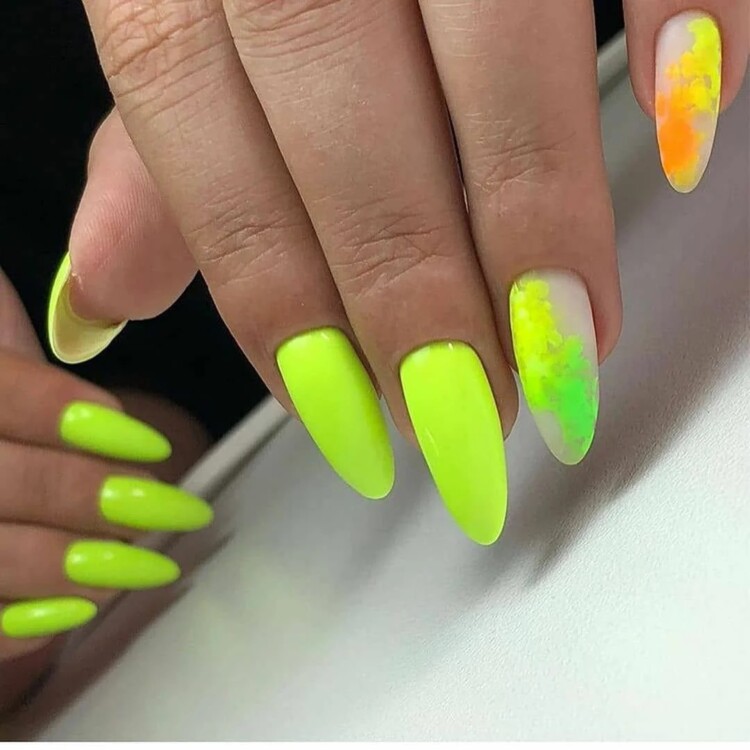 Неоновий відтінок гель-лаку особливо користується популярністю серед теплої пори року. Тут немає ніяких обмежень. У вигляді декору підійде все, що завгодно.