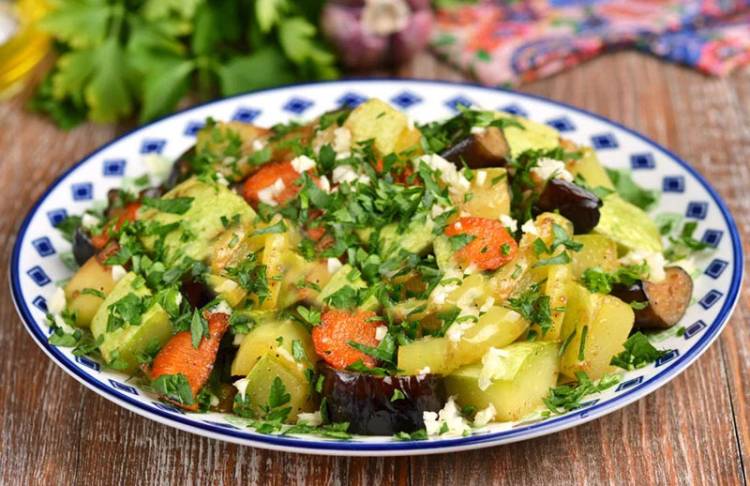Соте з овочів перекладаємо на тарілку і посипаємо дрібно нарізаним часником.