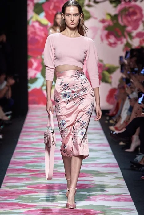 Шовкова тканина – характерний штрих в тенденції літнього сезону. Дорогий і елітарний матеріал рожевого відтінку ефектно доповнюється квітковим принтом блакитних тонів.