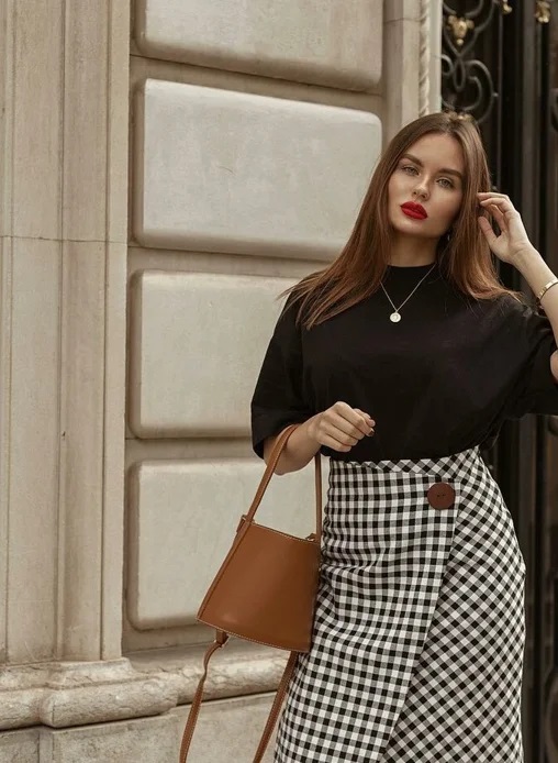Чарівна модель, виконана з модної картатої тканини, не втрачає своєї актуальності. Дивовижне поєднання класичного картатого малюнка і воланів створює хвилюючий образ молодості і краси. Стриманість спокійних відтінків спідниці підкреслюється яскравими аксесуарами.