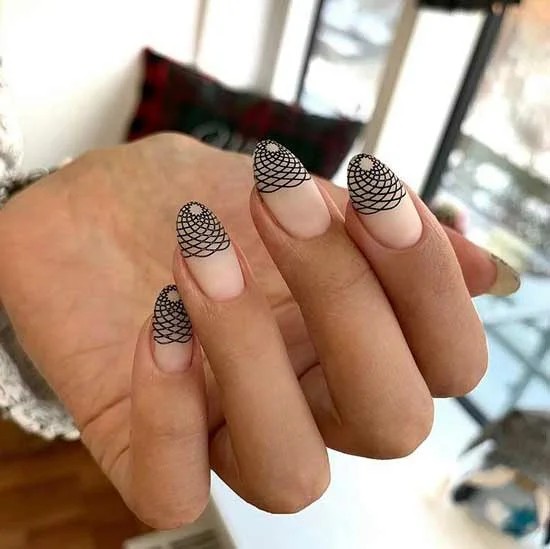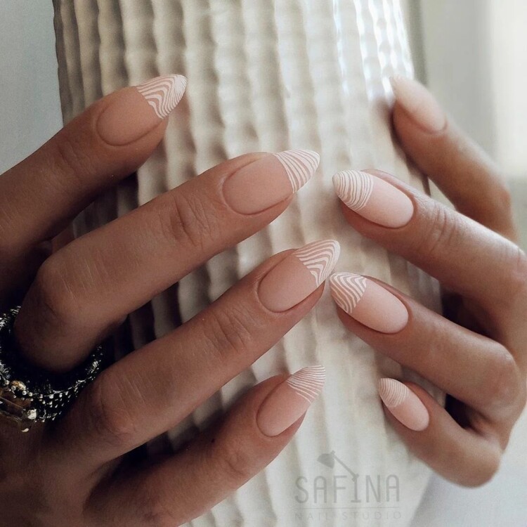 Якщо ти щаслива володарка довгих нігтів, то цей дизайн придуманий майстрами саме для тебе! В такому манікюрі замість звичної однотонної лінії посмішки наноситься витончений, хитромудрий узор за допомогою штампа. Особливо ніжно такий дизайн виглядає на нігтики мигдальної форми.