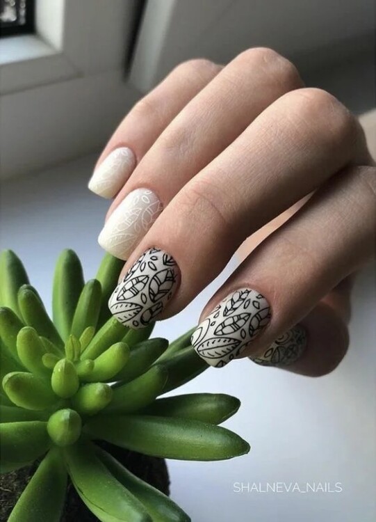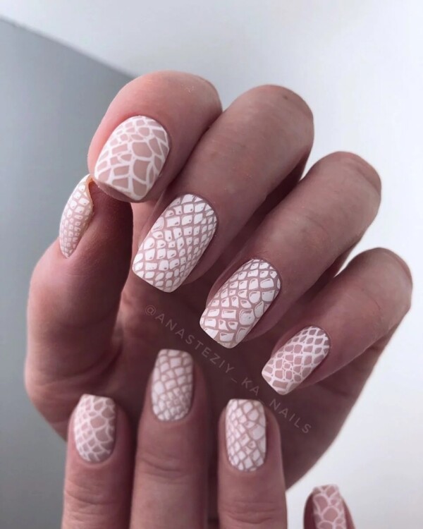 Якщо у тебе короткі нігті, то і для тебе є дизайн в стилі стемпінг. Витончений білий манікюр з принтом відмінно виглядає на нігтях форми м’який квадрат. Такий манікюр підійде як для повсякденного способу, так і для урочистого.