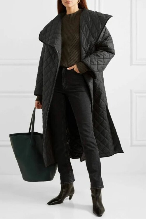 Стьобані пальта класичного чорного кольору з об’ємним коміром, на запах, з розрізами з боків і доповнені тонким ременем – виглядають дорого і витончено на жіночій фігурі.