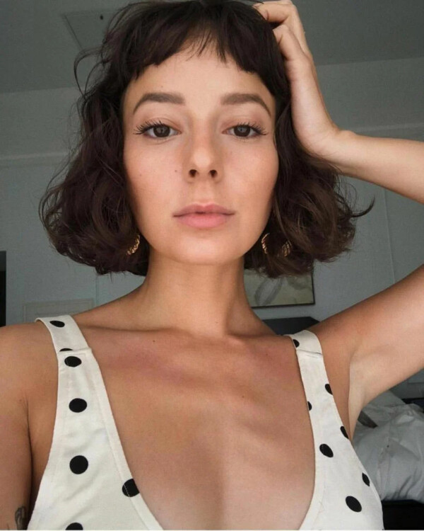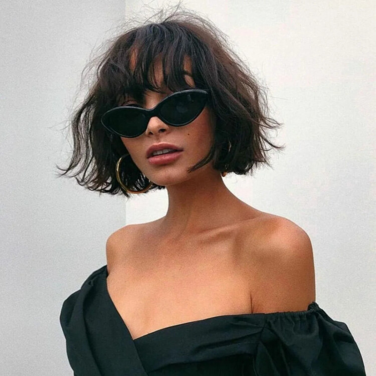 Варіант бобу на кучерявому волоссі з коротким злегка градуйованим чубчиком виглядає по-французьки романтично. Така стрижка має хороший побічний ефект – вона помітно омолоджує і робить волосся більш об’ємним.