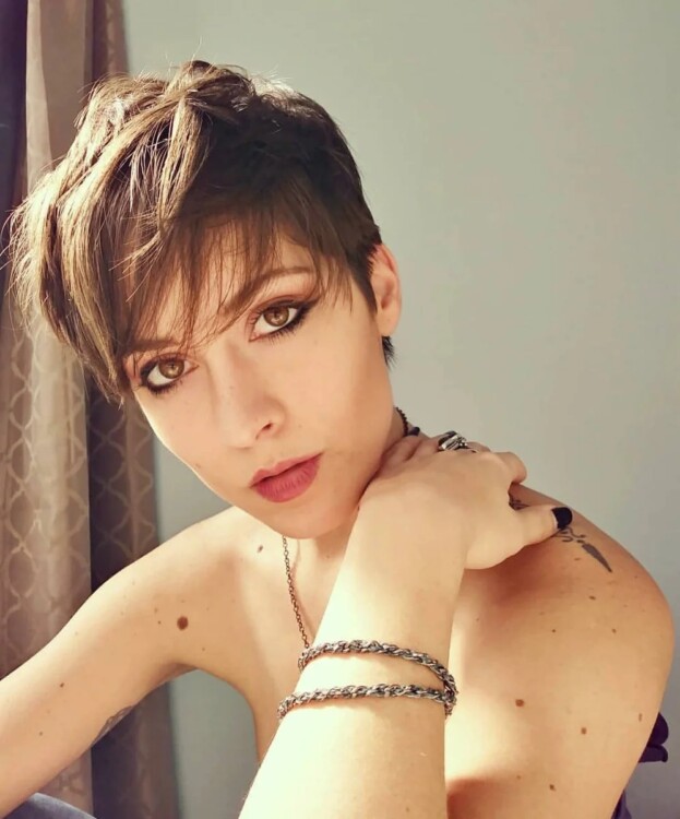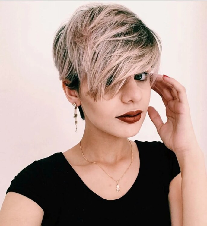 Подовжений чубчик – головна особливість Пікс. З його допомогою жінки розставляють акценти і отримують гарний образ, який виділяється з натовпу. Якщо захотіти, чубок в будь-який момент можна прибрати і створити не менш цікаву укладку.