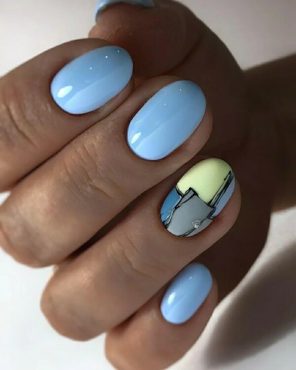 Можна вибрати однотонну базу блакитного кольору урізноманітнивши її авангардним дизайном в приглушених тонах.